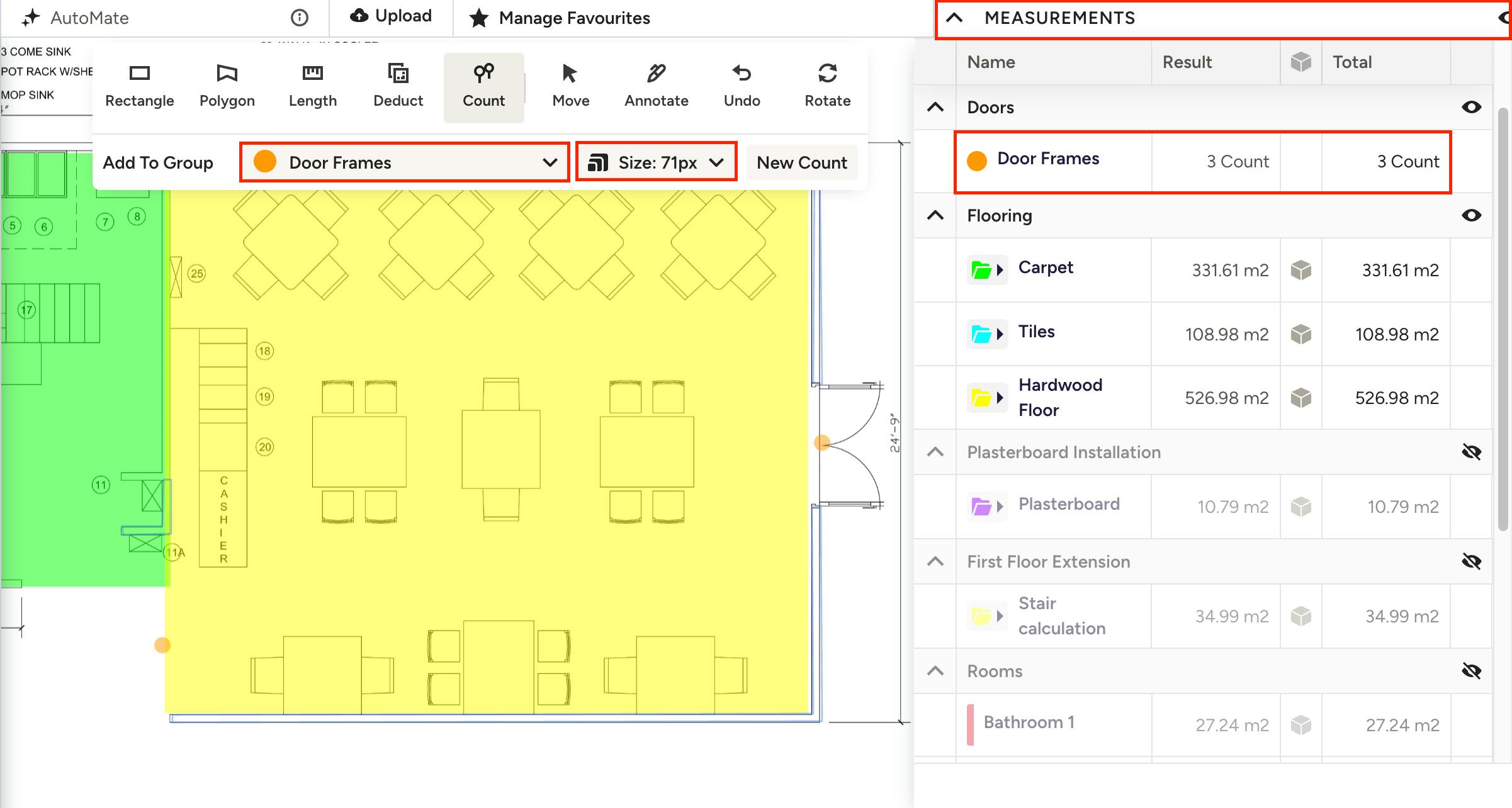 In this example, the orange circle is counting the number of door frames, which you'll see appear in the new group within the Measurements section.