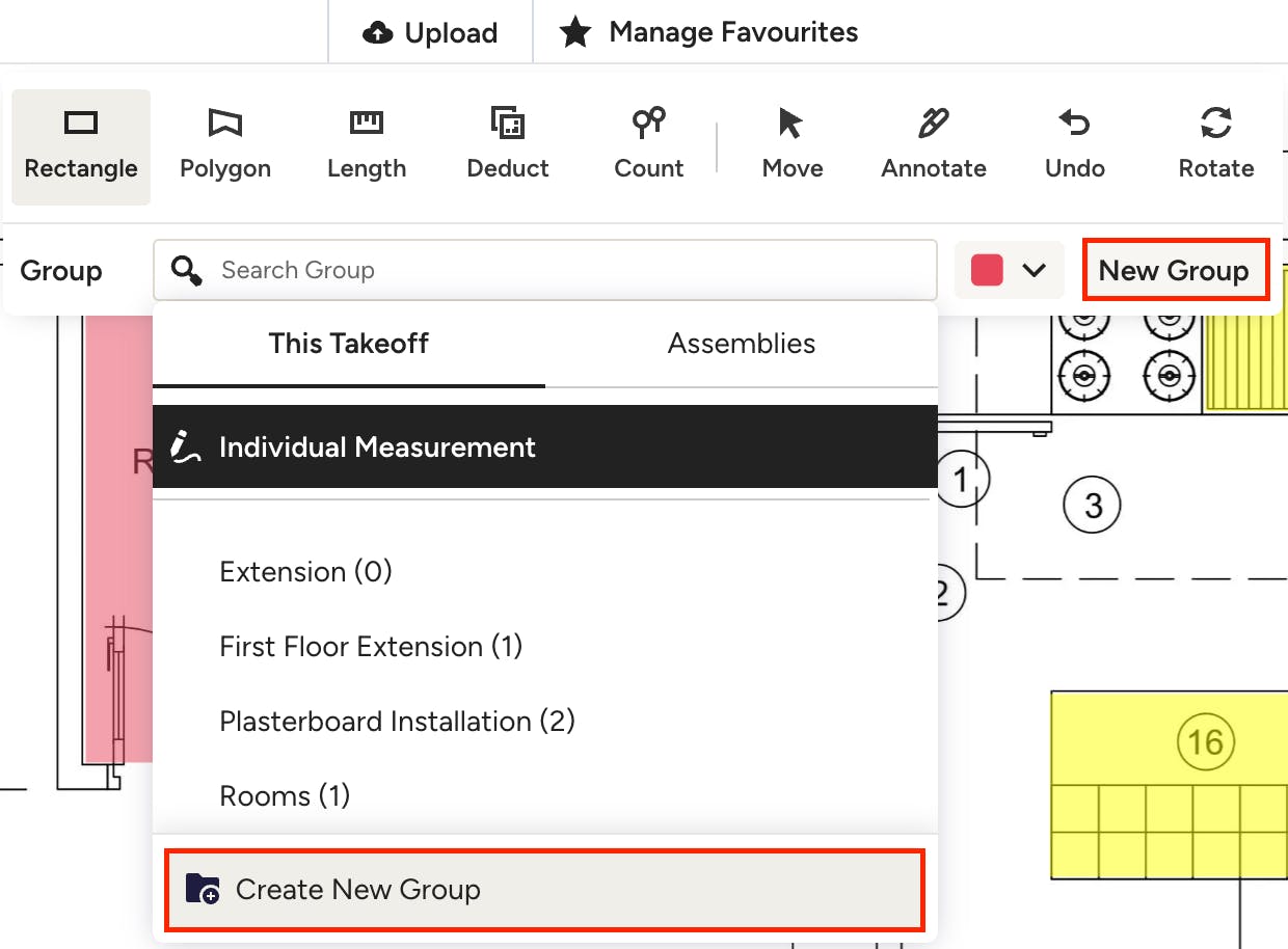 To use an existing group or assembly, click any of your measurement tools in your toolbar menu, then click on the group dropdown. Select the relevant group from This Takeoff tab or select an existing assembly from the Assemblies tab. Continue to create your measurement, and once it's complete you'll see it appear in the selected group within the Measurements section.