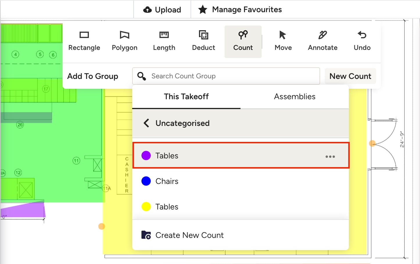 To use an existing count group or assembly, click on the count tool, then click on the count group dropdown. Select the relevant group from This Takeoff tab or select an existing assembly from the Assemblies tab. Continue to add your counts on the canvas, and you'll see them appear in the selected group within the Measurements section.