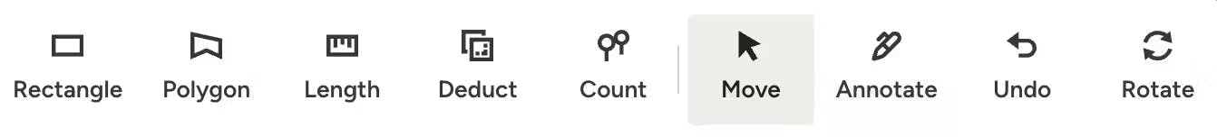 To move/edit: Click the pointer icon, then click and drag the measurement or count where needed. To adjust the size, click on a corner or middle dot on a line to change the height or length.